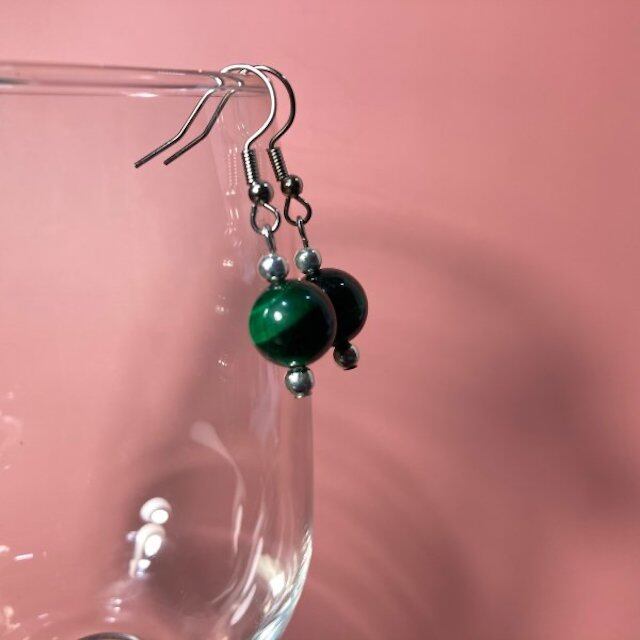 こちらは、10mm玉のグリーンタイガーアイを使用した一粒フックピアスです。シンプルなデザインはシーン問わず、どんなコーディネートにも合わせ易く使い勝手がいいアイテムです。今回は一粒ピアスの要望が多かった為制作しました。気になる方は是非この機会にどうぞ。