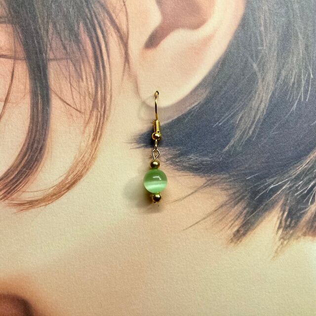 こちらは、8mm玉のキャッツアイを使用した一粒フックピアスです。シンプルなデザインはシーン問わず、どんなコーディネートにも合わせ易く使い勝手がいいアイテムです。今回は一粒ピアスの要望が多かった為制作しました。気になる方は是非この機会にどうぞ。