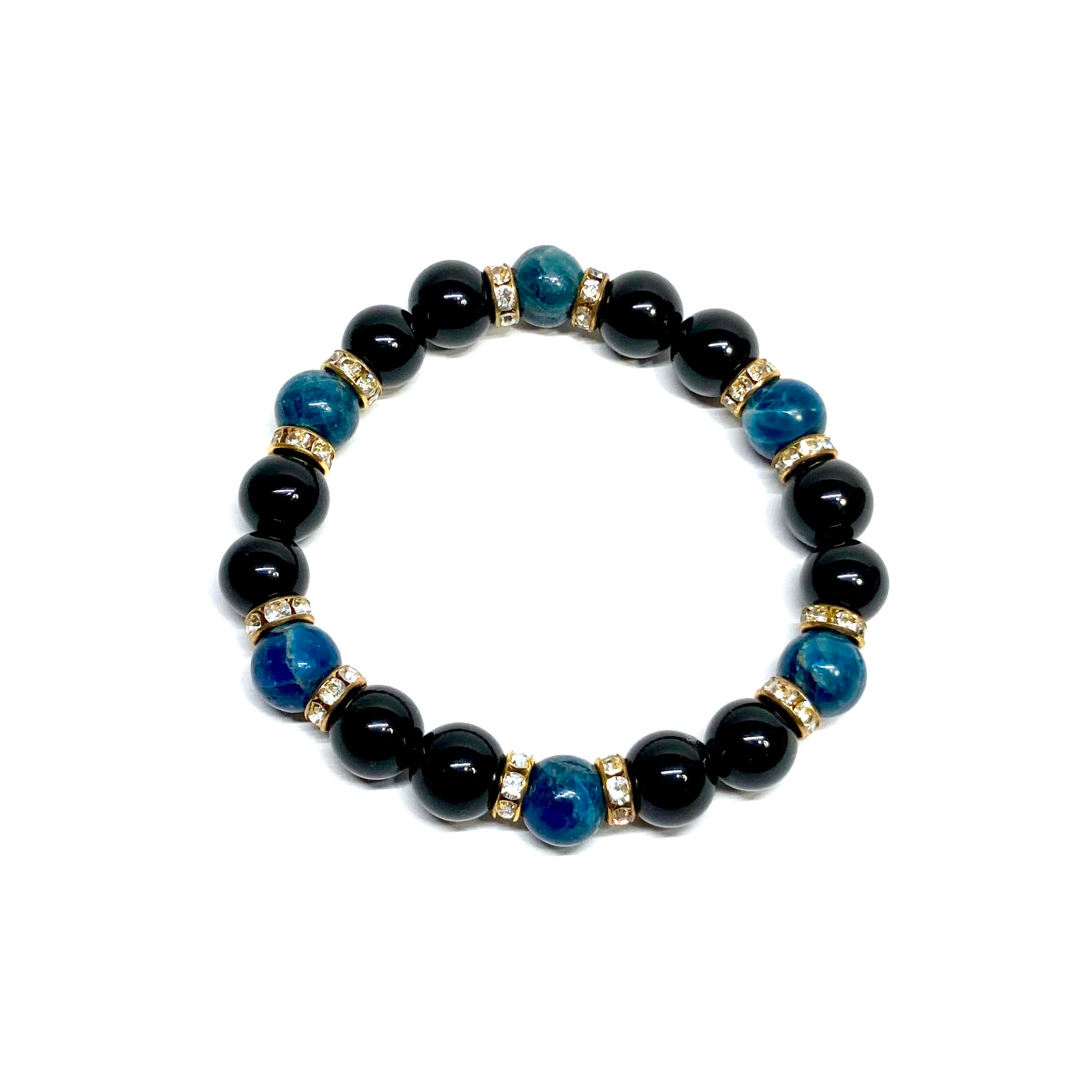 こちらは、モリオンとアパタイトを組み合わせたパワーストーンブレスレットです。間にはロンデルを挟み高級感あるデザインに仕上げております。石大きさは腕にも馴染みやすいように10mm玉で内径約18cm(伸可能)です。 数に限りがございますので気になる方はお早めにどうぞ。