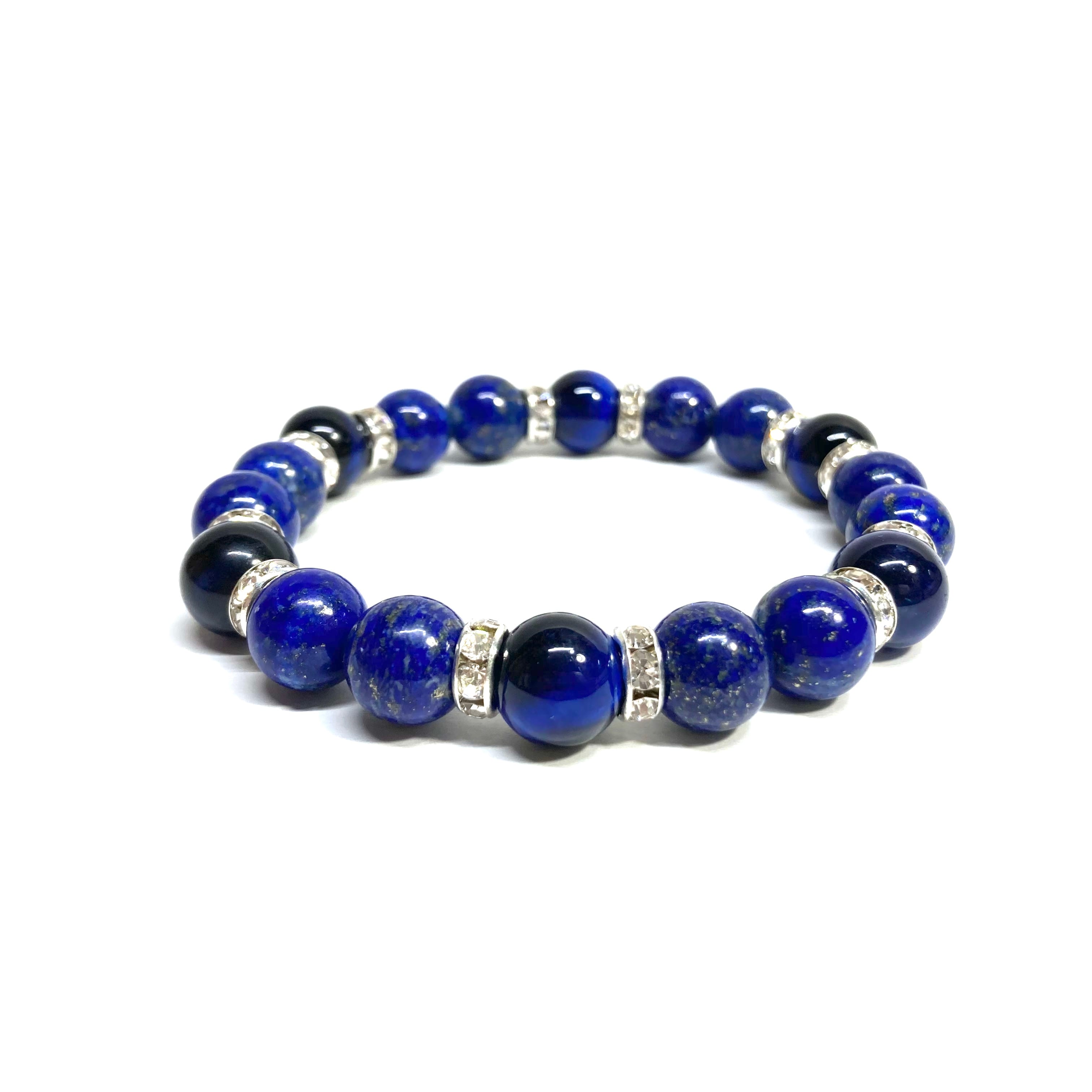 こちらは、ラピスラズリとブルータイガーアイを組み合わせたパワーストーンブレスレットです。間にはロンデルを挟み高級感あるデザインに仕上げております。石大きさは腕にも馴染みやすいように10mm玉で内径約18cm(伸可能)です。 数に限りがございますので気になる方はお早めにどうぞ。