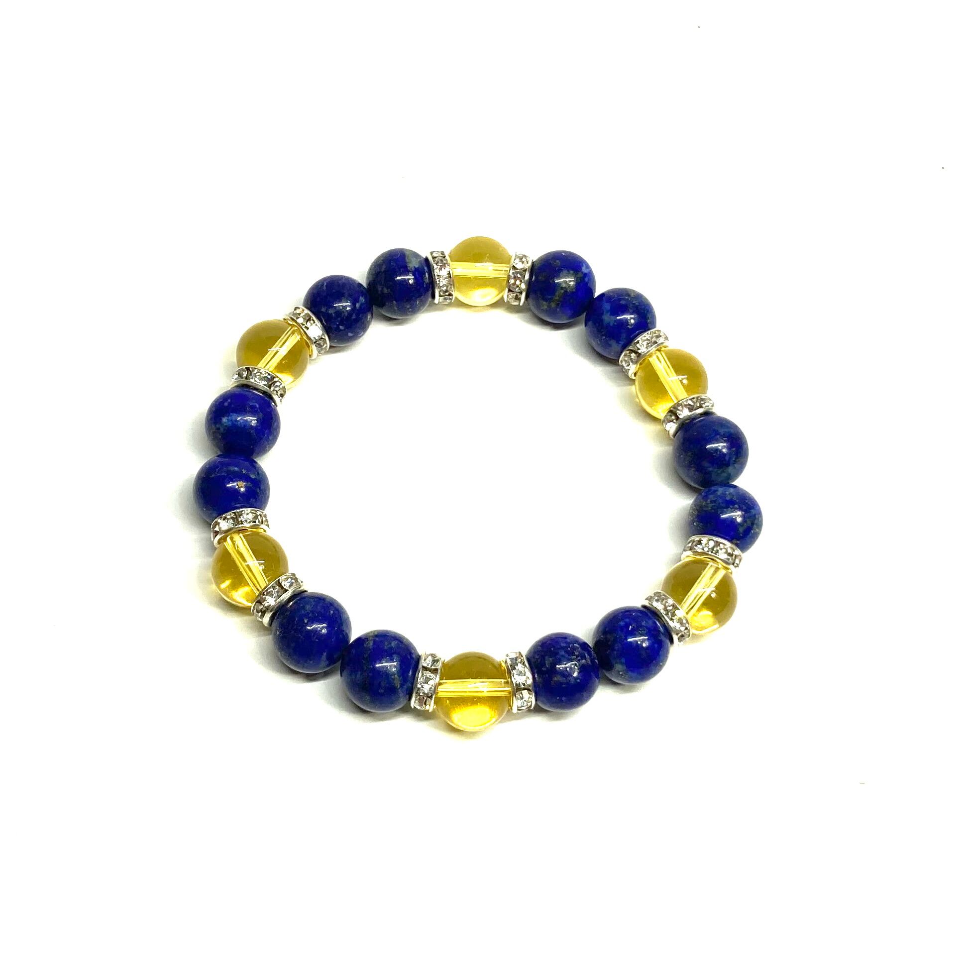 こちらは、ラピスラズリとシトリンを組み合わせたパワーストーンブレスレットです。間にはロンデルを挟み高級感あるデザインに仕上げております。石大きさは腕にも馴染みやすいように10mm玉で内径約18cm(伸可能)です。 数に限りがございますので気になる方はお早めにどうぞ。