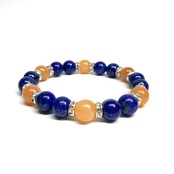 こちらは、ラピスラズリとレッドアベンチュリンを組み合わせたパワーストーンブレスレットです。間にはロンデルを挟み高級感あるデザインに仕上げております。石大きさは腕にも馴染みやすいように10mm玉で内径約18cm(伸可能)です。 数に限りがございますので気になる方はお早めにどうぞ。
