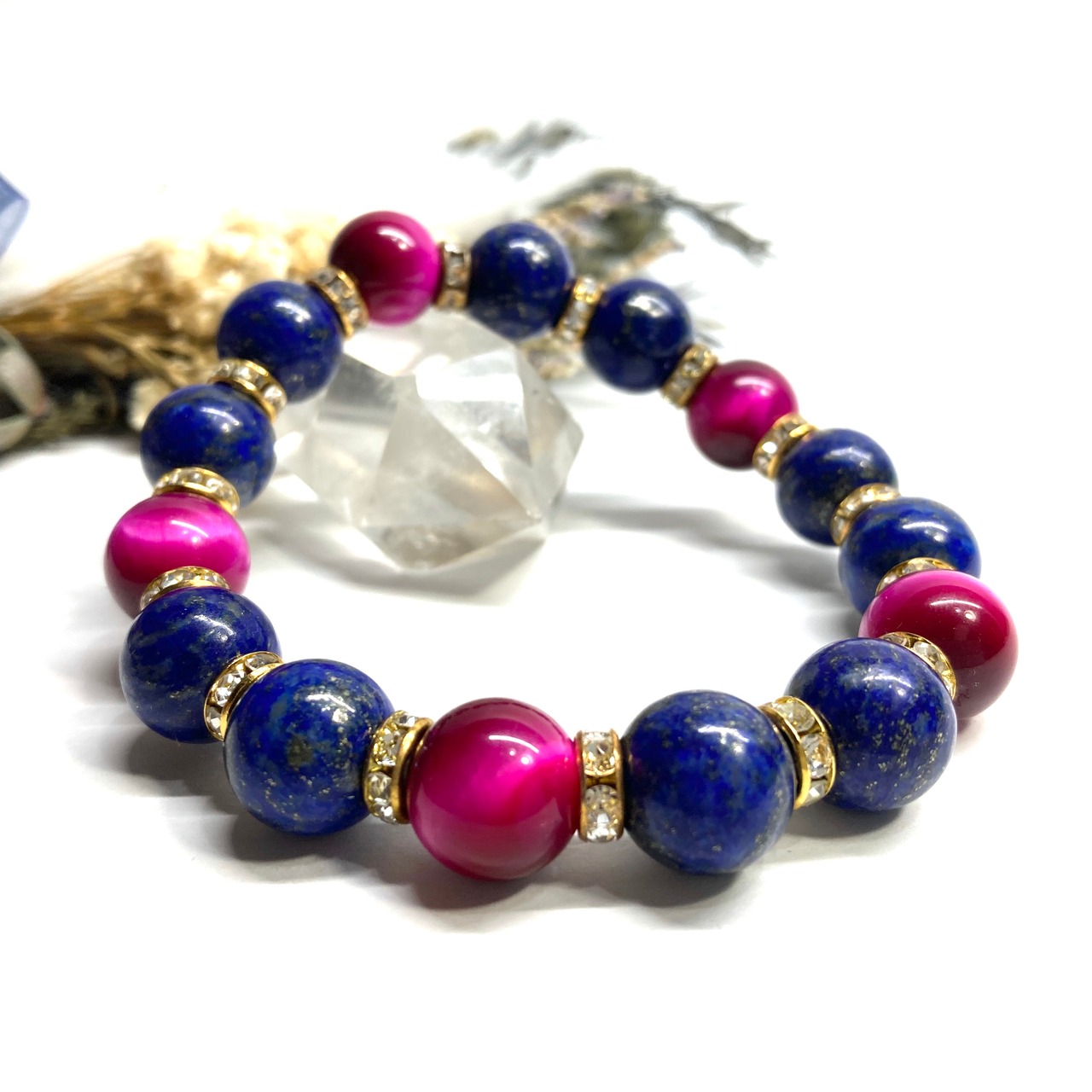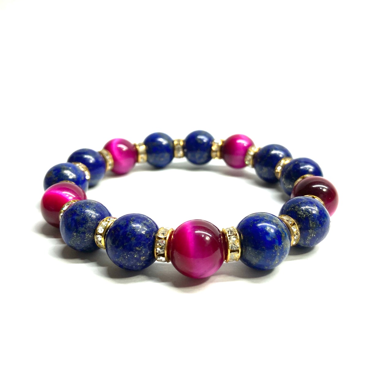 こちらは、ラピスラズリとピンクタイガーアイを組み合わせたパワーストーンブレスレットです。間にはロンデルを挟み高級感あるデザインに仕上げております。石大きさは12mm玉を使用して内周 約18cmです。気になる方は是非この機会にどうぞ。
