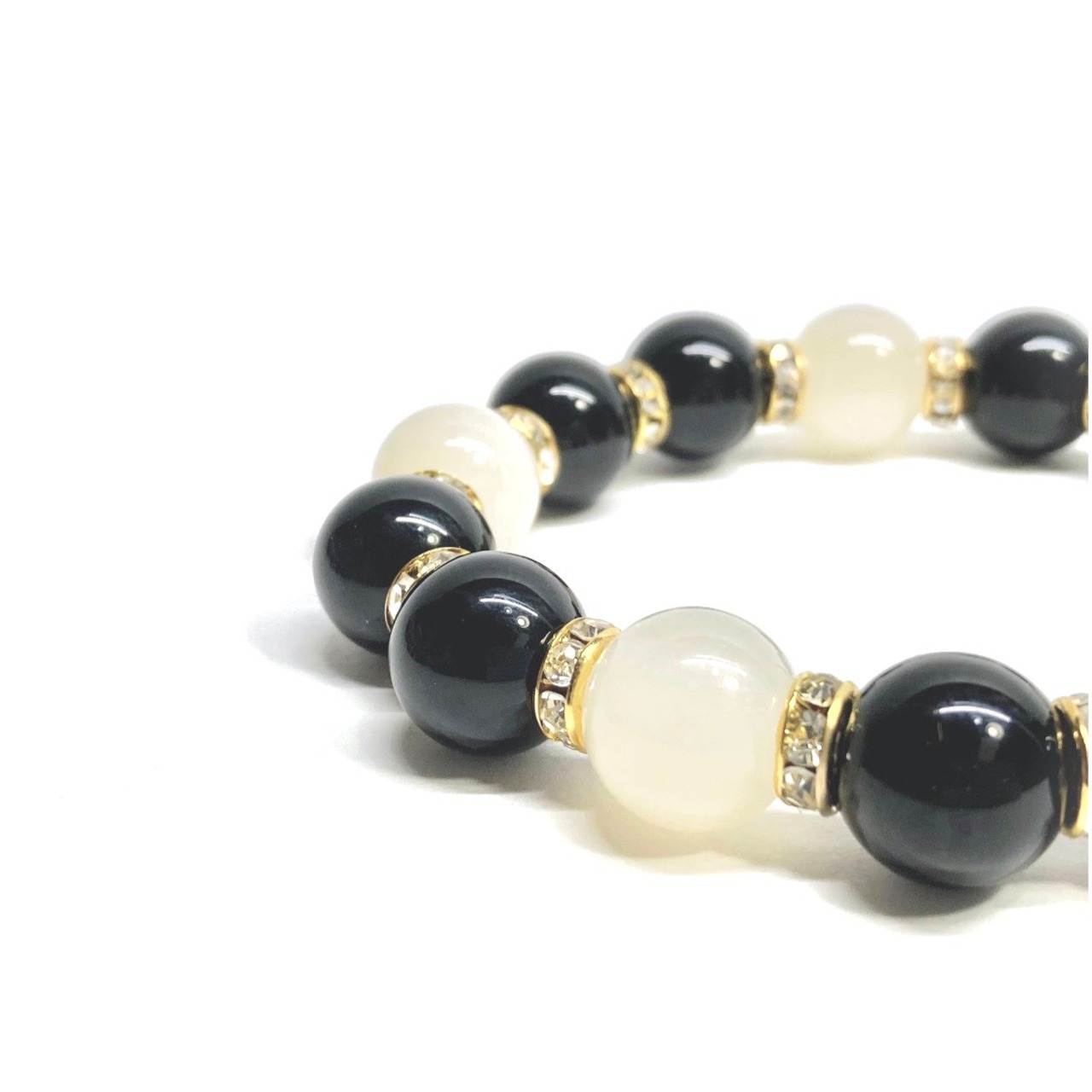 こちらは、モリオンとムーンストーンを組み合わせたパワーストーンブレスレットです。間にはロンデルを挟み高級感あるデザインに仕上げております。石大きさは12mm玉を使用して内周 約18cmです。気になる方は是非この機会にどうぞ。
