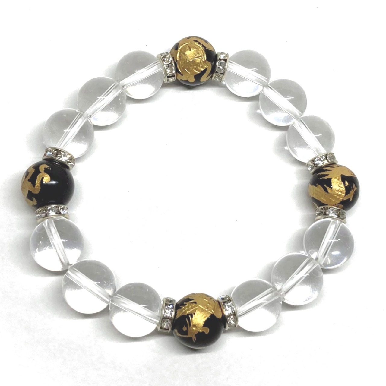 12mm 四神獣金彫オニキス×水晶 パワーストーン ブレスレット天然石 運気上昇 開運 金運 恋愛運 お守り 青龍 白虎 玄武 朱雀 4月誕生石 S