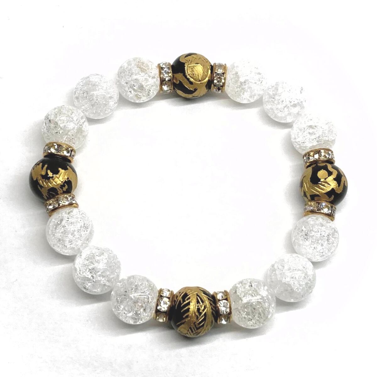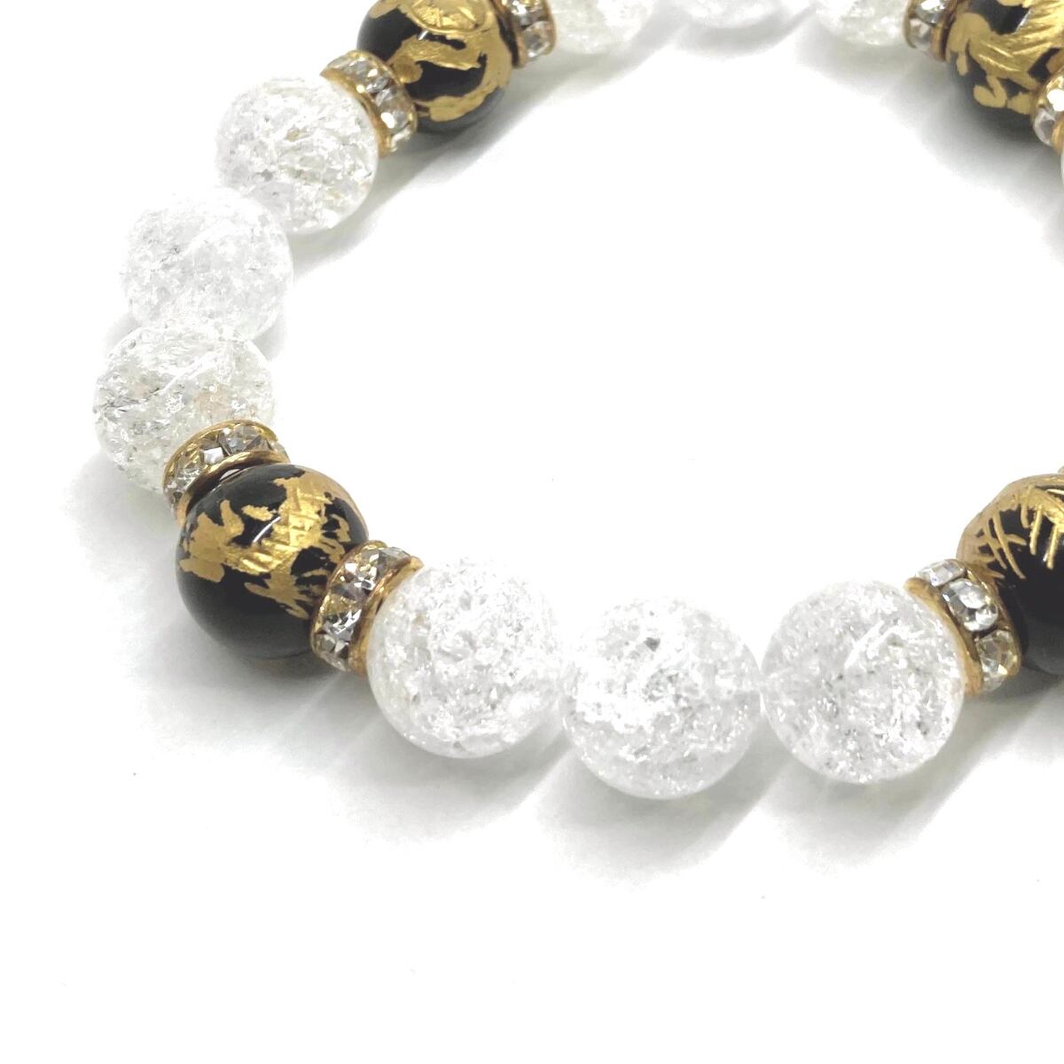 ご覧頂いているブレスレットは、四神獣金彫オニキスとクラック水晶を組み合わせたブレスレット。守り神である四神とパワーストーンの組み合わせで運気の流れを引き寄せる強運ブレスレットです。シンプルなデザインで男女問わず、年齢問わずご使用頂けるデザインなっております。シンプルなデザインは日常のアクセントとして、仕事やビジネスカジュアル、パーティーや特別なイベントなど様々なシーン活用できます。また、ちょっと贈り物にも最適なブレスレットになっております。四神獣を身につけて厄災から身を守り、多くの運気を呼び込まれてください。