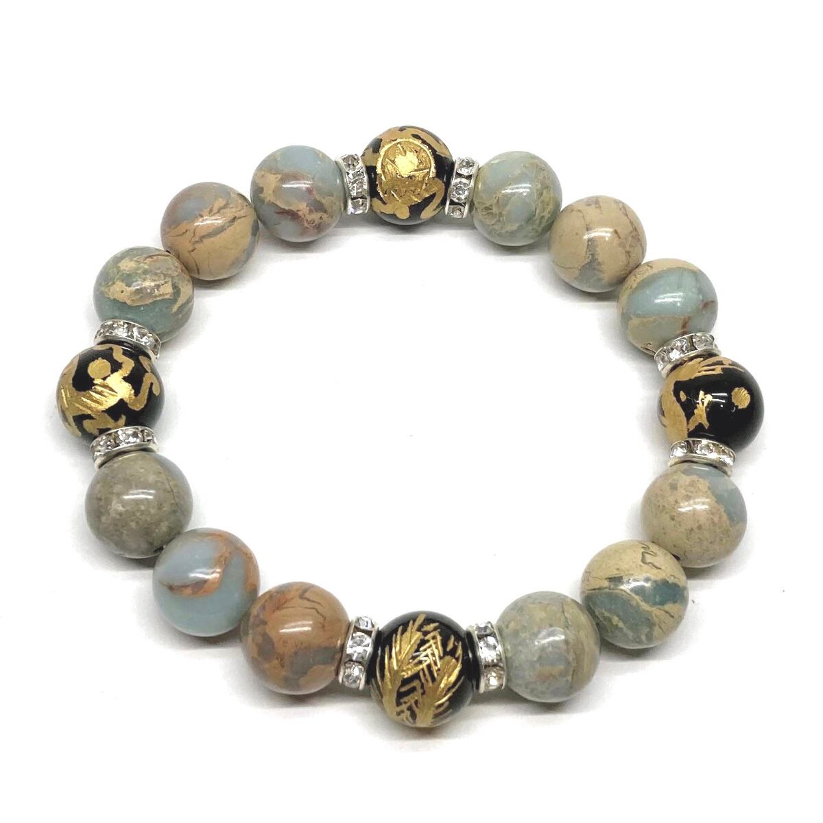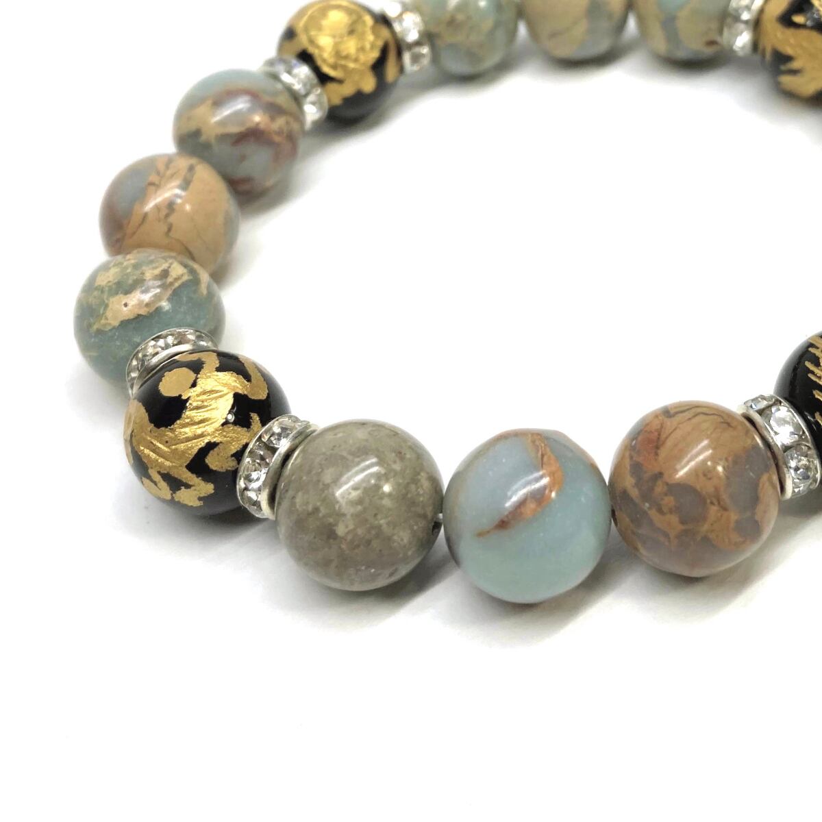 ご覧頂いているブレスレットは、四神獣金彫オニキスとインプレッションストーンを組み合わせたブレスレット。守り神である四神とパワーストーンの組み合わせで運気の流れを引き寄せる強運ブレスレットです。シンプルなデザインで男女問わず、年齢問わずご使用頂けるデザインなっております。シンプルなデザインは日常のアクセントとして、仕事やビジネスカジュアル、パーティーや特別なイベントなど様々なシーン活用できます。また、ちょっと贈り物にも最適なブレスレットになっております。四神獣を身につけて厄災から身を守り、多くの運気を呼び込まれてください。