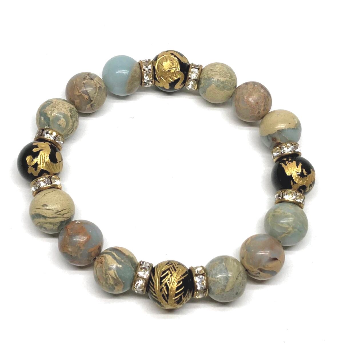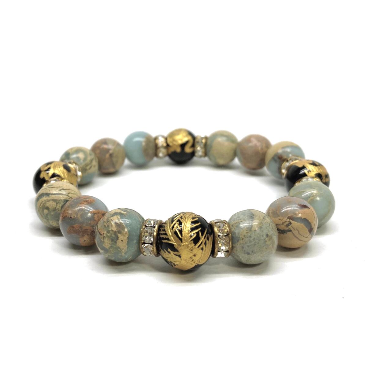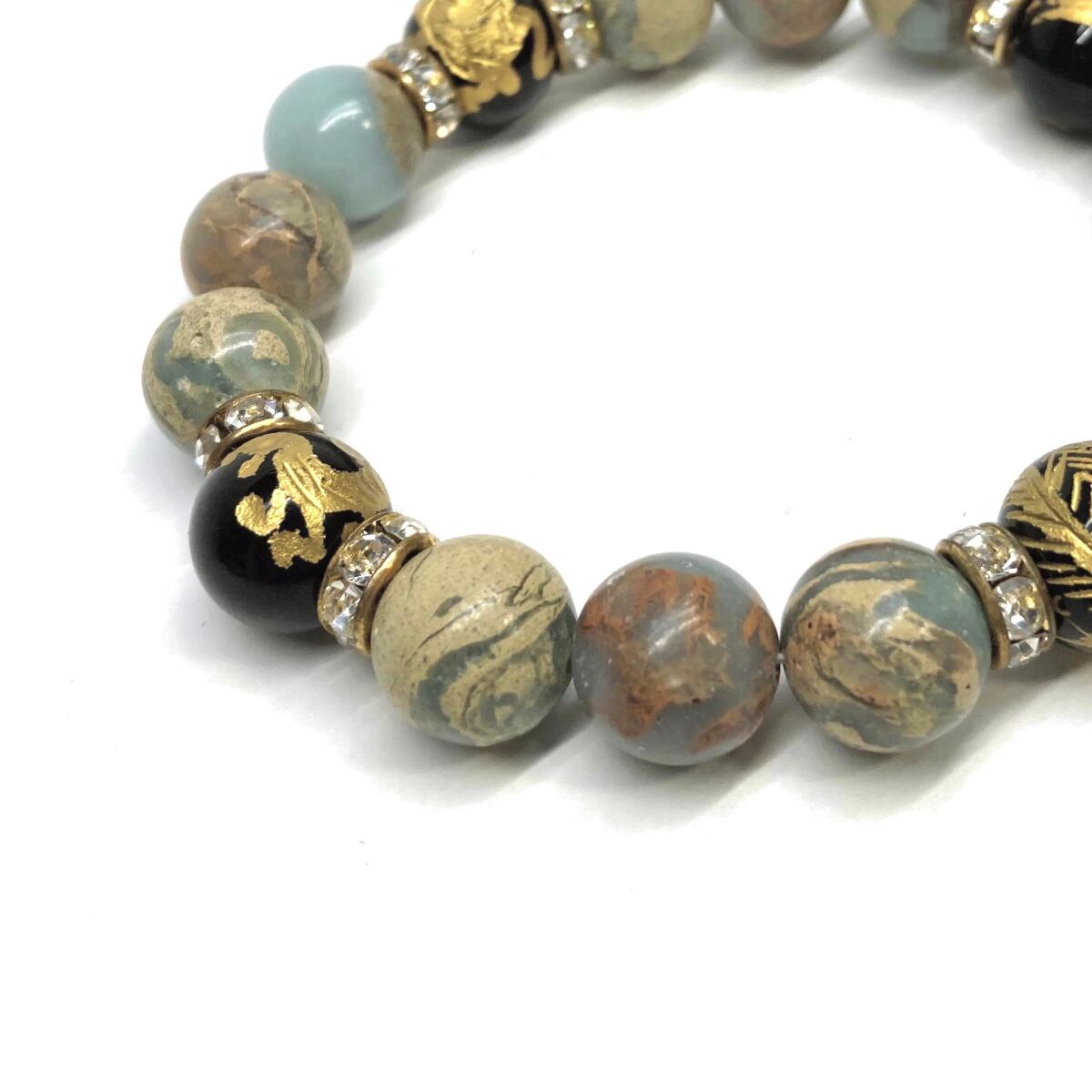 12mm 四神獣金彫オニキス×インプレッションストーン パワーストーン ブレスレット天然石 運気上昇 開運 お守り 青龍 白虎 玄武 朱雀 GD