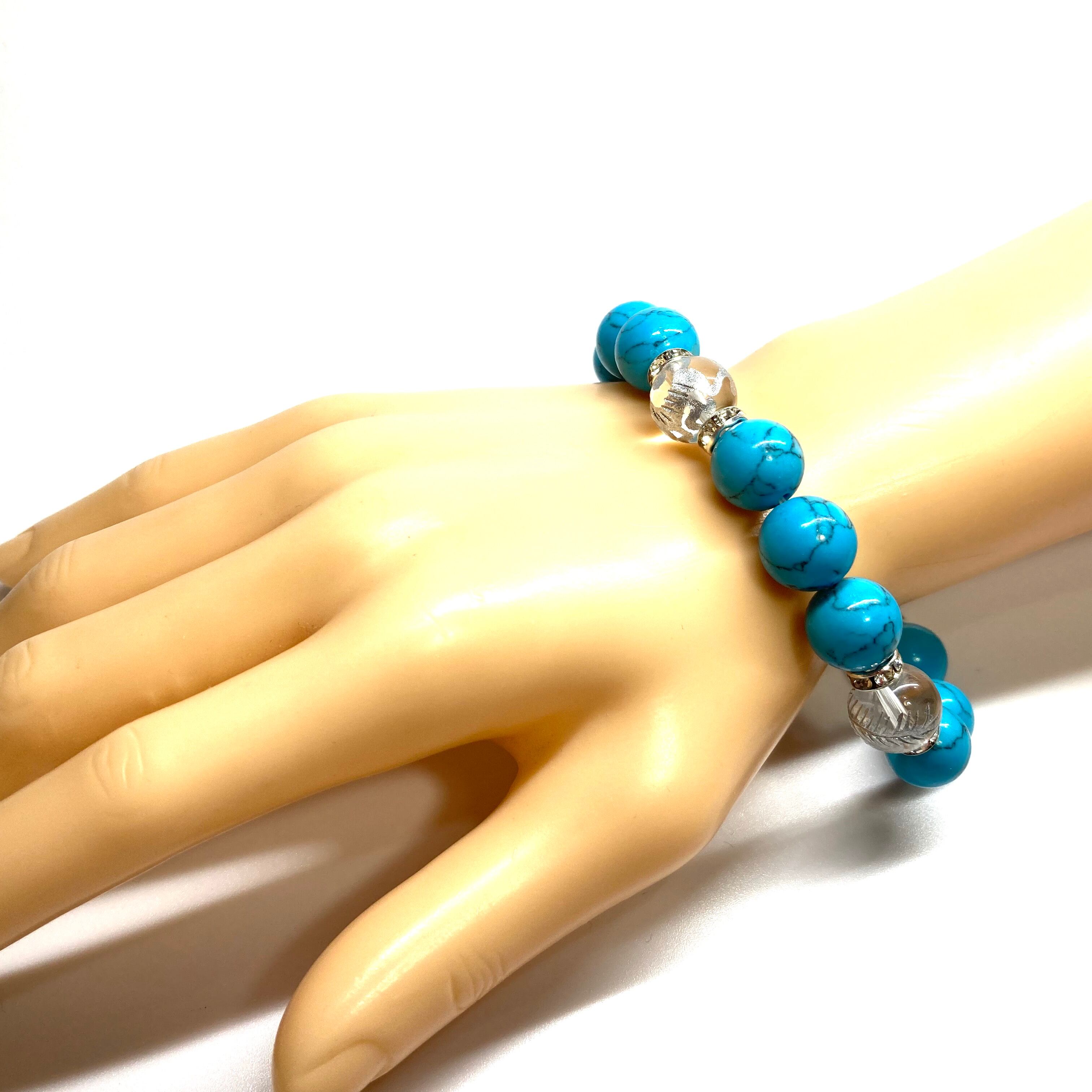12mm 四神獣銀彫水晶×ターコイズ パワーストーン ブレスレット 運気上昇 開運 金運 健康運 厄除け お守り 青龍 白虎 玄武 朱雀 SL /1
