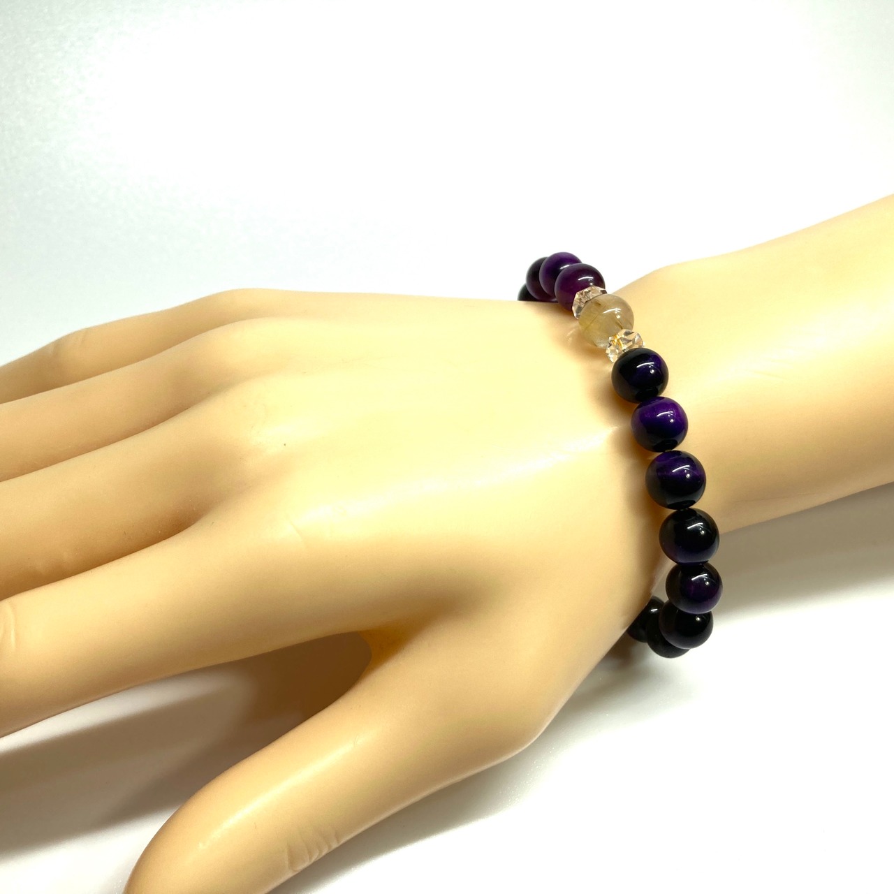 こちらは、ルチルクォーツとパープルタイガーアイを組み合わせた一粒ブレスレットです。石大きさ8mm玉で基本サイズは内周15cmです。(サイズ変更は1cmあたり100円で承っております。サイズ変更の場合は金額変更しますのでメッセージにてご連絡くださいませ。)プチギフトとしてプレゼントしてもいいと思います。