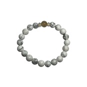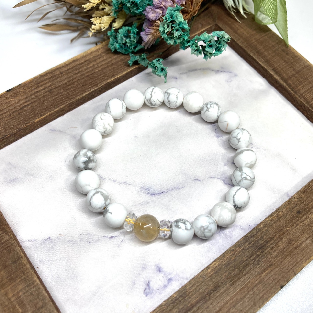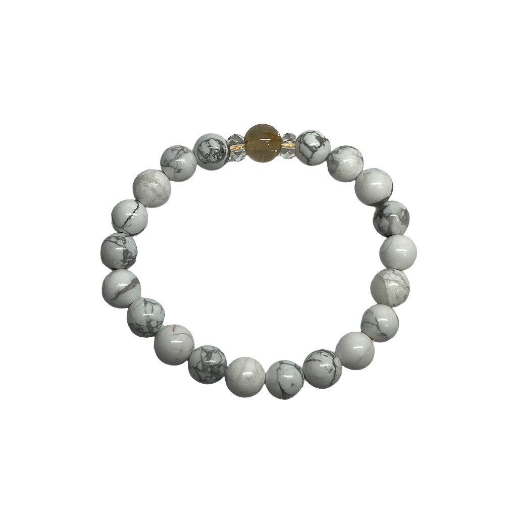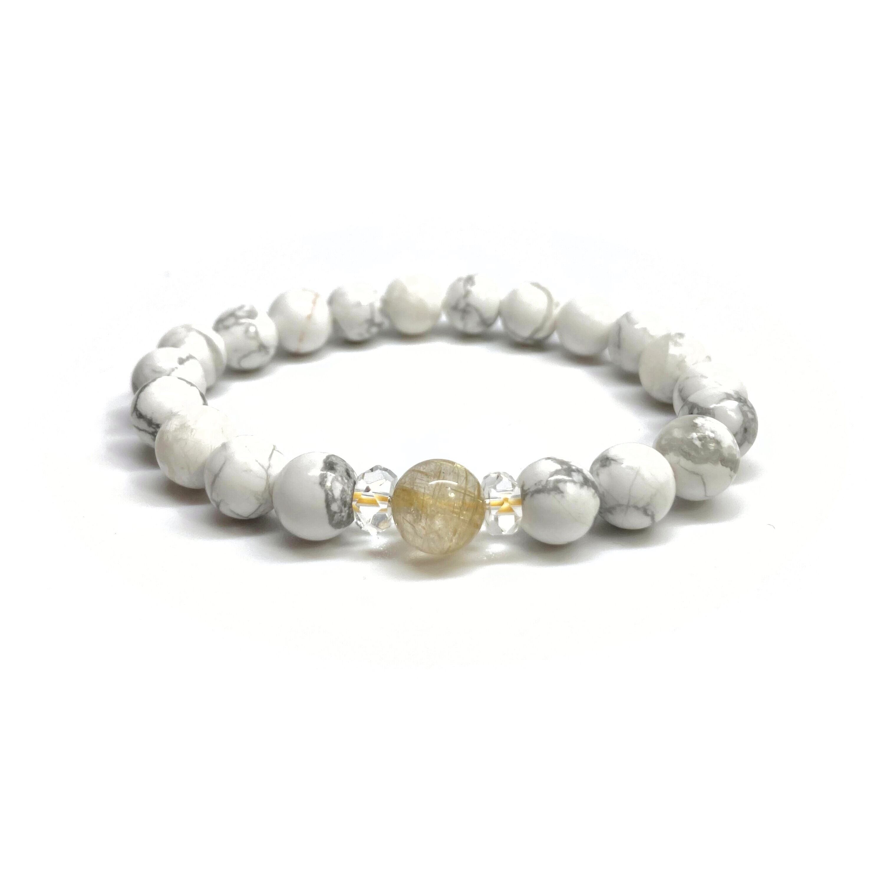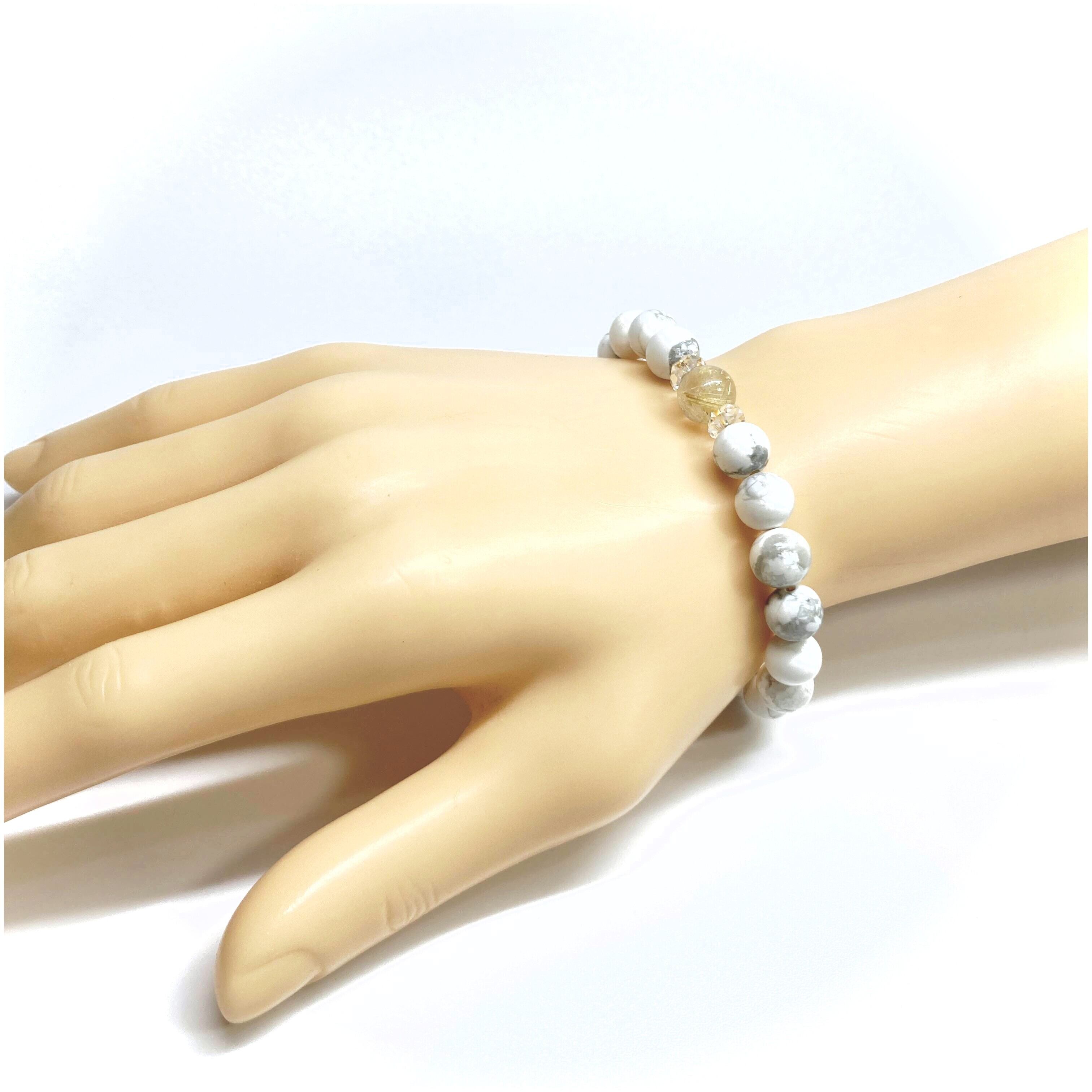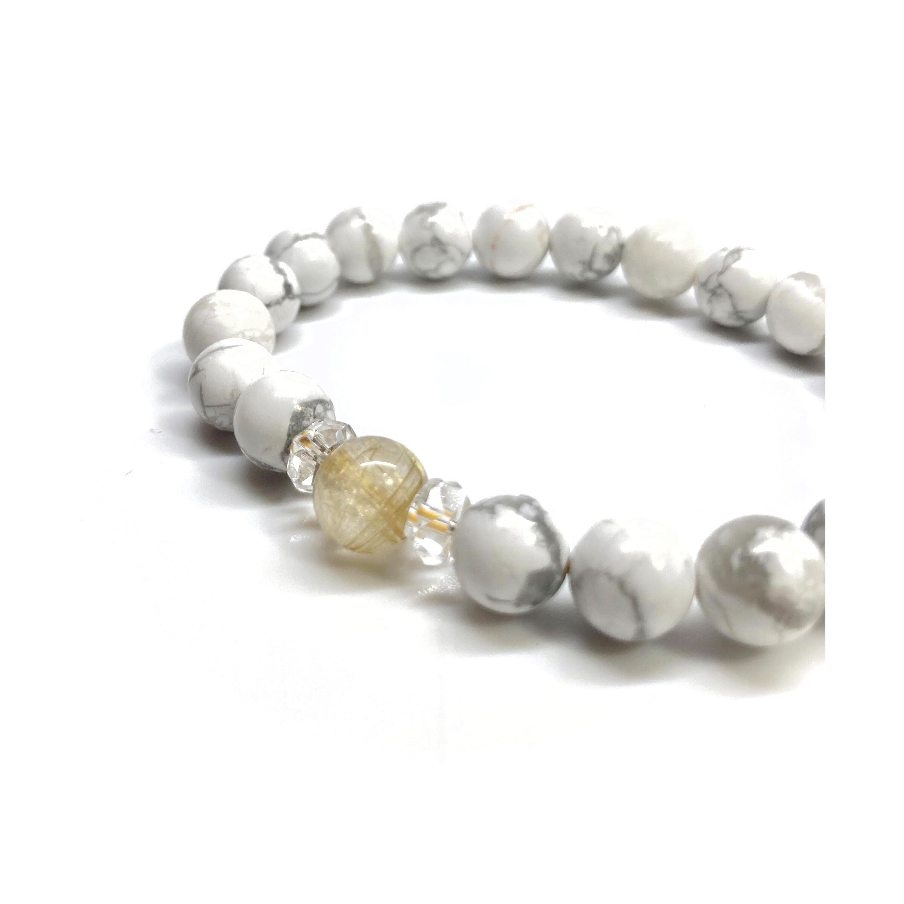 こちらは、ルチルクォーツとハウライトを組み合わせた一粒ブレスレットです。石大きさ8mm玉で基本サイズは内周15cmです。(サイズ変更は1cmあたり100円で承っております。サイズ変更の場合は金額変更しますのでメッセージにてご連絡くださいませ。)プチギフトとしてプレゼントしてもいいと思います。