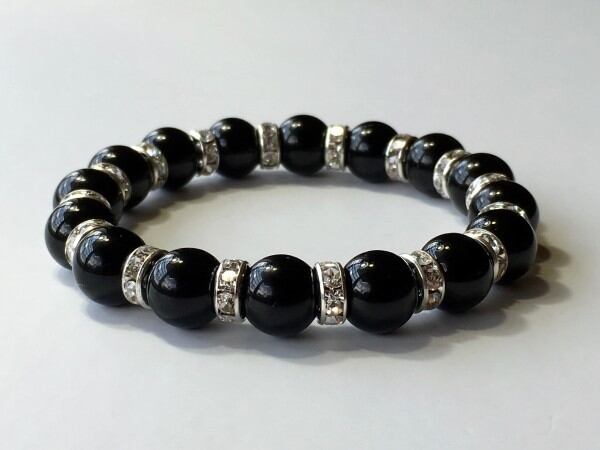 こちらは、10mm玉のオニキスを使用した天然石ブレスレットです。間にはシルバーのロンデルで高級感あるデザインです。石大きさは腕にも馴染みやすいように10mm玉で内周約18cm(伸可能)です。気になる方は是非この機会にどうぞ。