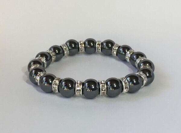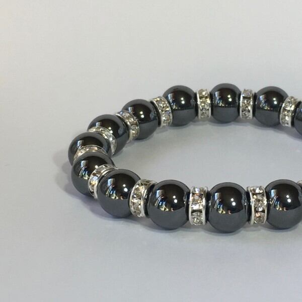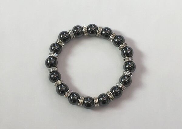 こちらは、10mm玉のヘマタイトを使用した天然石ブレスレットです。間にはシルバーのロンデルで高級感あるデザインです。石大きさは腕にも馴染みやすいように10mm玉で内周約18cm(伸可能)です。気になる方は是非この機会にどうぞ。