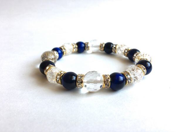 こちらは、12mm玉の128面カット水晶と10mmブルータイガーアイとクラック水晶を使用したブレスレットです。間にはロンデルを挟み高級感あるデザインに仕上げています。サイズは内周約17.5cm(伸可能)です。気になる方は是非この機会にどうぞ。