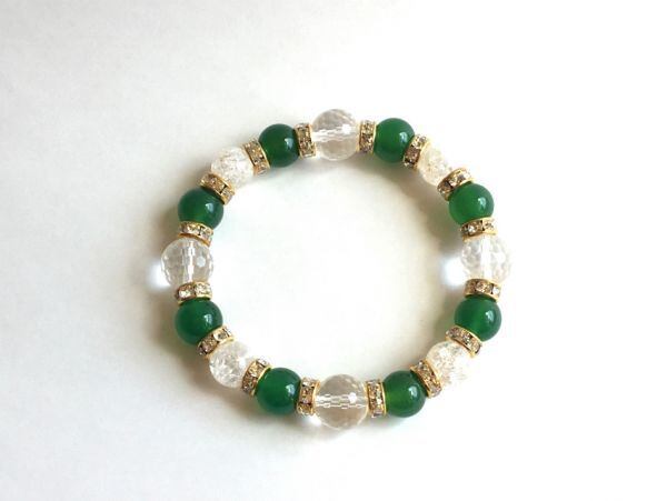 こちらは、12mm玉の128面カット水晶と10mm赤メノウとクラック水晶を使用したブレスレットです。間にはロンデルを挟み高級感あるデザインに仕上げています。サイズは内周約17.5cm(伸可能)です。気になる方は是非この機会にどうぞ。