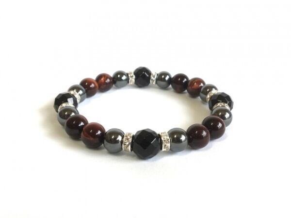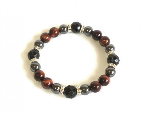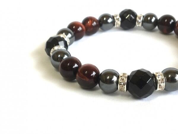 こちらは、12mm玉の64面カットオニキスと10mmヘマタイトとレッドタイガーアイを使用したブレスレットです。間にはロンデルを挟み高級感あるデザインに仕上げています。サイズは内周約18.5cm(伸可能)です。気になる方は是非この機会にどうぞ。
