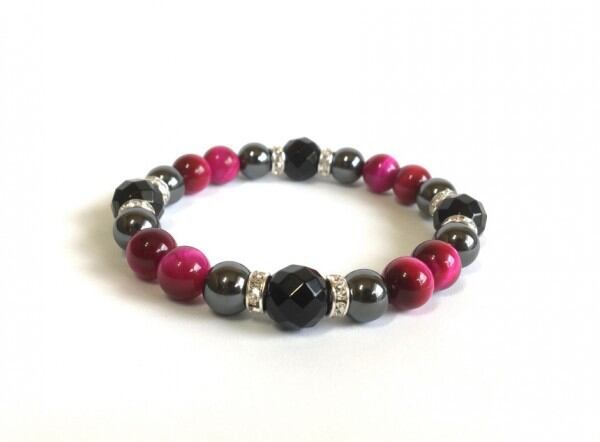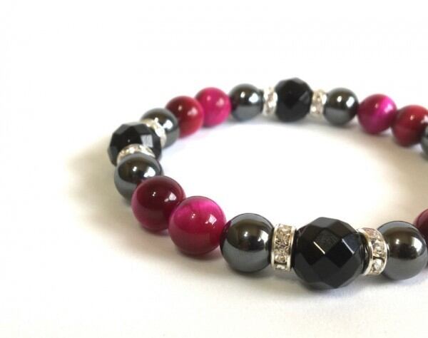 こちらは、12mm玉の64面カットオニキスと10mmヘマタイトとピンクタイガーアイを使用したブレスレットです。間にはロンデルを挟み高級感あるデザインに仕上げています。サイズは内周約18.5cm(伸可能)です。気になる方は是非この機会にどうぞ。