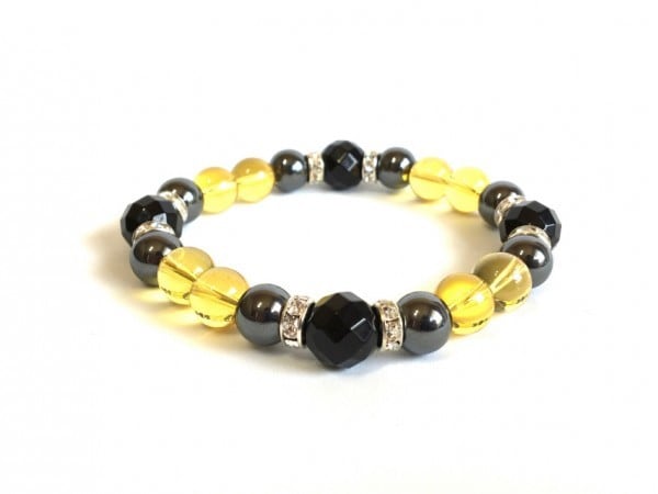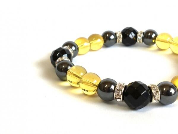 こちらは、12mm玉の64面カットオニキスと10mmヘマタイトとシトリンを使用したブレスレットです。間にはロンデルを挟み高級感あるデザインに仕上げています。サイズは内周約18.5cm(伸可能)です。気になる方は是非この機会にどうぞ。