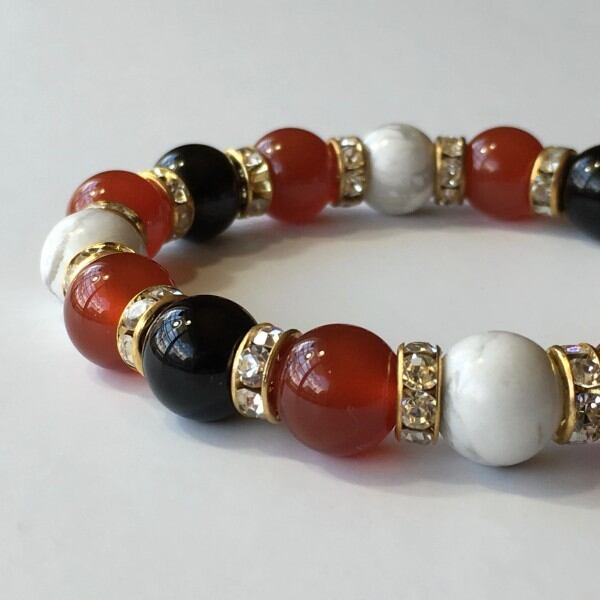 こちらは、赤メノウとオニキスとハウライトのミックスブレスレットです。石の間にはロンデルを組み合わせ上品な印象で高級感溢れるデザインに仕上げています。石大きさは腕にも馴染みやすいように10mm玉で内周約17cm(伸可能)です。気になる方は是非この機会にどうぞ。
