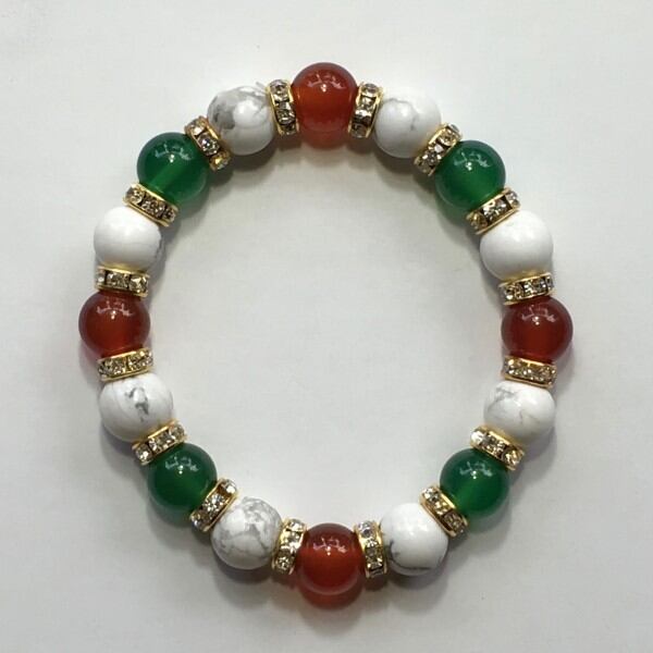 こちらは、赤メノウと緑メノウとハウライトのミックスブレスレットです。石の間にはロンデルを組み合わせ上品な印象で高級感溢れるデザインに仕上げています。石大きさは腕にも馴染みやすいように10mm玉で内周約17cm(伸可能)です。気になる方は是非この機会にどうぞ。