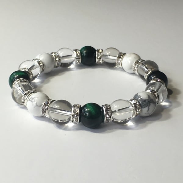こちらは、グリーンタイガーアイと水晶とハウライトのミックスブレスレットです。石の間にはロンデルを組み合わせ上品な印象で高級感溢れるデザインに仕上げています。石大きさは腕にも馴染みやすいように10mm玉で内周約17cm(伸可能)です。気になる方は是非この機会にどうぞ。