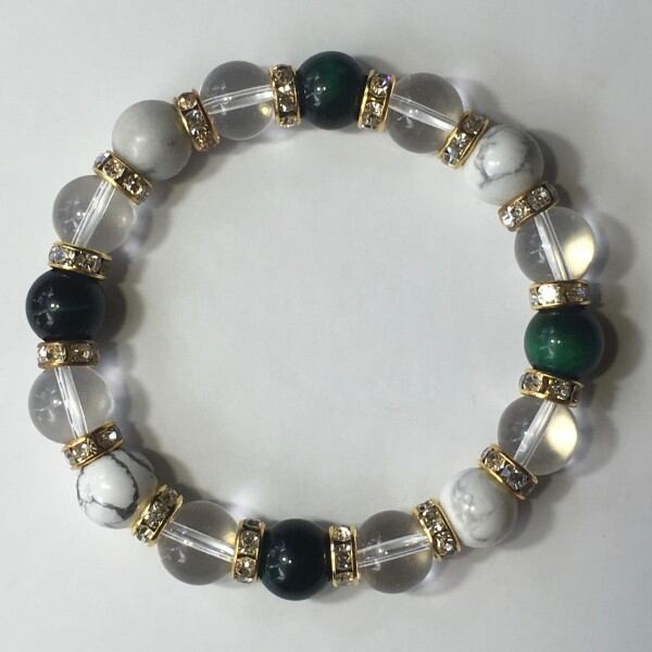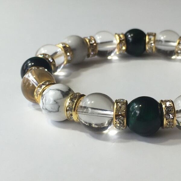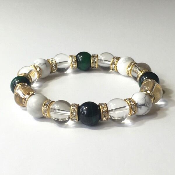 こちらは、グリーンタイガーアイと水晶とハウライトのミックスブレスレットです。石の間にはロンデルを組み合わせ上品な印象で高級感溢れるデザインに仕上げています。石大きさは腕にも馴染みやすいように10mm玉で内周約17cm(伸可能)です。気になる方は是非この機会にどうぞ。