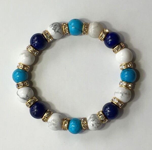 こちらは、ターコイズとラピスラズリとハウライトのミックスブレスレットです。石の間にはロンデルを組み合わせ上品な印象で高級感溢れるデザインに仕上げています。石大きさは腕にも馴染みやすいように10mm玉で内周約17cm(伸可能)です。気になる方は是非この機会にどうぞ。
