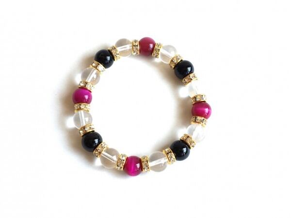こちらは、ピンクタイガーアイと水晶とオニキスのミックスブレスレットです。石の間にはロンデルを組み合わせ上品な印象で高級感溢れるデザインに仕上げています。石大きさは腕にも馴染みやすいように10mm玉で内周約17cm(伸可能)です。気になる方は是非この機会にどうぞ。