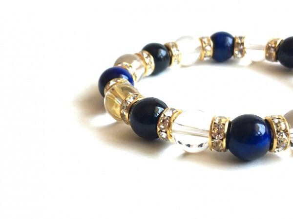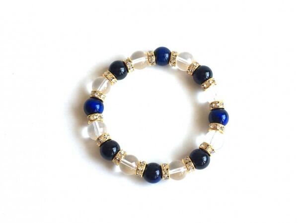 こちらは、ブルータイガーアイと水晶とオニキスのミックスブレスレットです。石の間にはロンデルを組み合わせ上品な印象で高級感溢れるデザインに仕上げています。石大きさは腕にも馴染みやすいように10mm玉で内周約17cm(伸可能)です。気になる方は是非この機会にどうぞ。