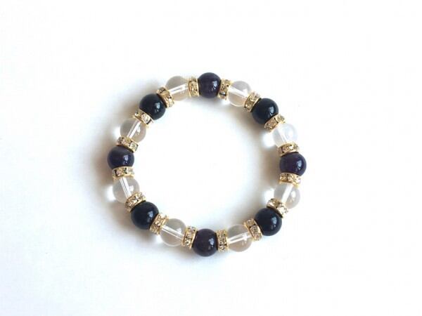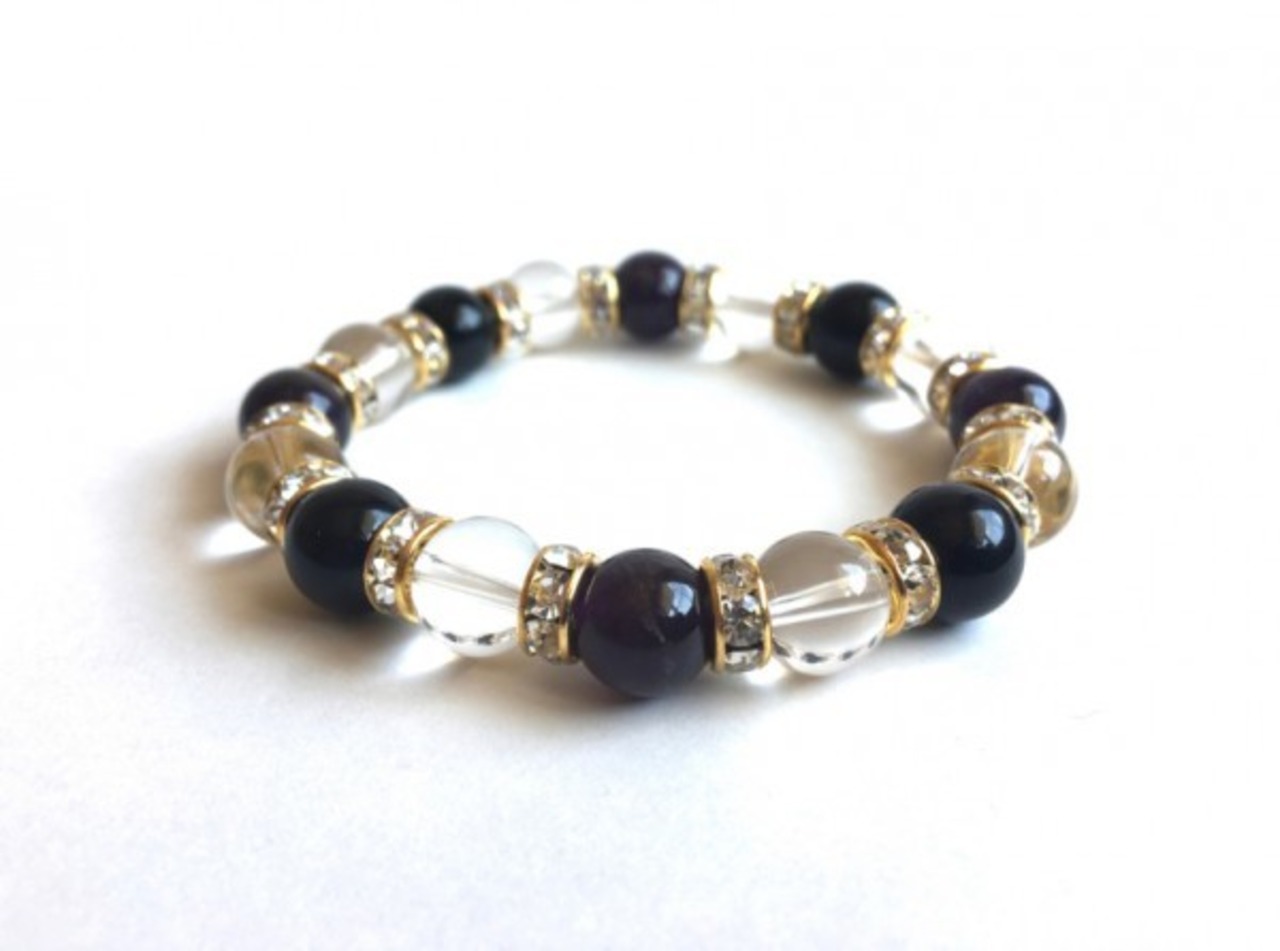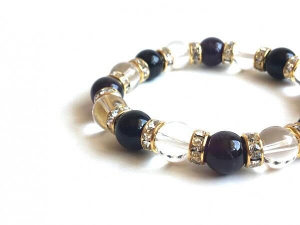 こちらは、アメジストと水晶とオニキスのミックスブレスレットです。石の間にはロンデルを組み合わせ上品な印象で高級感溢れるデザインに仕上げています。石大きさは腕にも馴染みやすいように10mm玉で内周約17cm(伸可能)です。気になる方は是非この機会にどうぞ。
