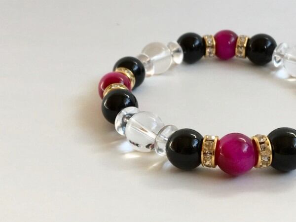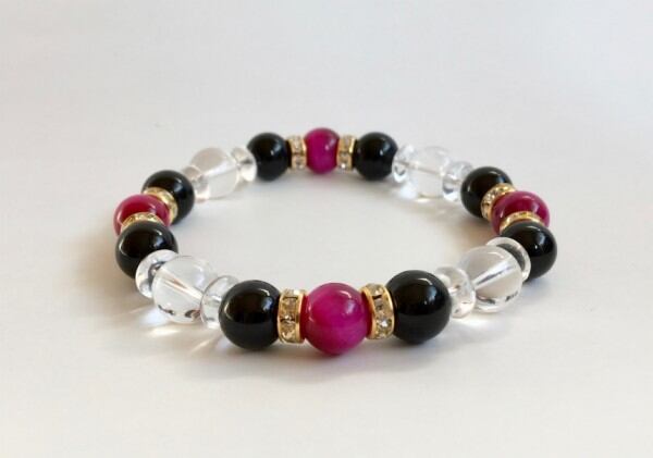 こちらは、ピンクタイガーアイとオニキスと水晶を組み合わせたパワーストーンブレスレットです。石の間にはロンデルと、今回は水晶ソロバンを使用してシンプルなデザインの中に上品な印象をプラスしたブレスレットです。石大きさは腕にも馴染みやすいように10mm玉で内周約18cm(伸可能)です。気になる方は是非この機会にどうぞ。