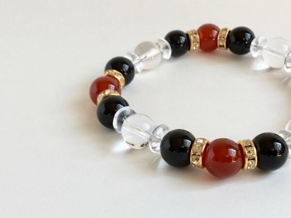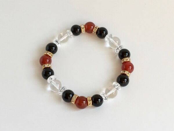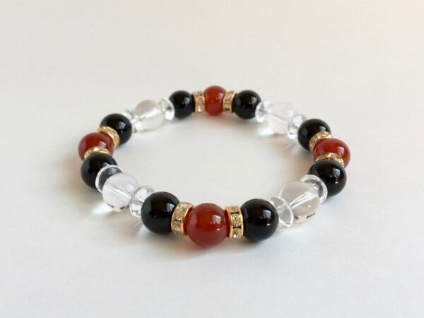こちらは、赤メノウとオニキスと水晶を組み合わせたパワーストーンブレスレットです。石の間にはロンデルと、今回は水晶ソロバンを使用してシンプルなデザインの中に上品な印象をプラスしたブレスレットです。石大きさは腕にも馴染みやすいように10mm玉で内周約18cm(伸可能)です。気になる方は是非この機会にどうぞ。