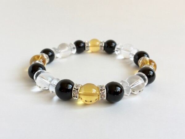 こちらは、シトリンとオニキスと水晶を組み合わせたパワーストーンブレスレットです。石の間にはロンデルと、今回は水晶ソロバンを使用してシンプルなデザインの中に上品な印象をプラスしたブレスレットです。石大きさは腕にも馴染みやすいように10mm玉で内周約18cm(伸可能)です。気になる方は是非この機会にどうぞ。