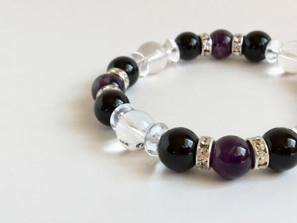 こちらは、アメジストとオニキスと水晶を組み合わせたパワーストーンブレスレットです。石の間にはロンデルと、今回は水晶ソロバンを使用してシンプルなデザインの中に上品な印象をプラスしたブレスレットです。石大きさは腕にも馴染みやすいように10mm玉で内周約18cm(伸可能)です。気になる方は是非この機会にどうぞ。