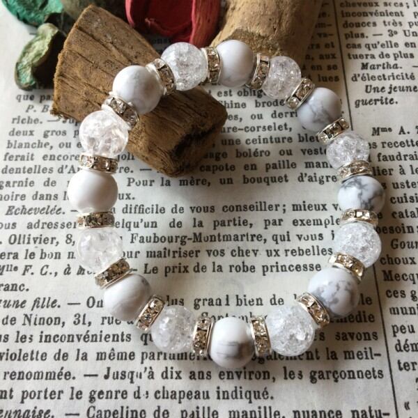 こちらは、ハウライトとクラック水晶のミックスブレスレットです。石との間にはロンデルを挟み高級感溢れるデザインに仕上げています。石大きさは腕にも馴染みやすいように10mm玉で内周約17cm(伸可能)です。気になる方は是非この機会にどうぞ。