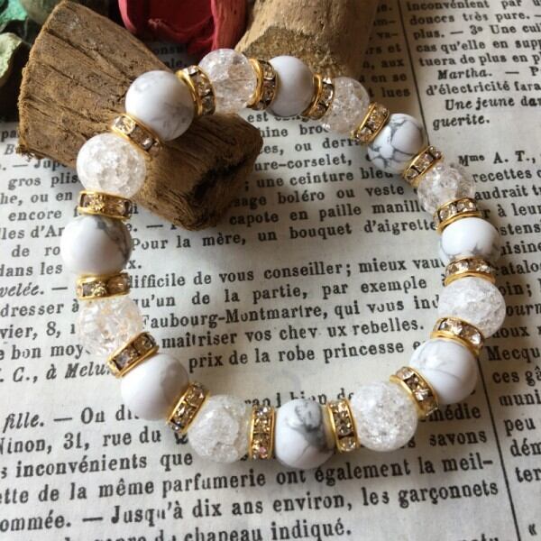 こちらは、ハウライトとクラック水晶のミックスブレスレットです。石との間にはロンデルを挟み高級感溢れるデザインに仕上げています。石大きさは腕にも馴染みやすいように10mm玉で内周約17cm(伸可能)です。気になる方は是非この機会にどうぞ。