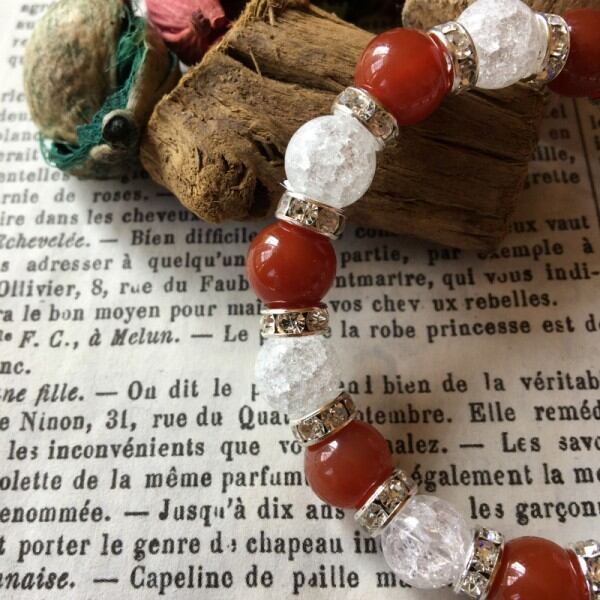 こちらは、赤メノウとクラック水晶のミックスブレスレットです。石との間にはロンデルを挟み高級感溢れるデザインに仕上げています。石大きさは腕にも馴染みやすいように10mm玉で内周約17cm(伸可能)です。気になる方は是非この機会にどうぞ。