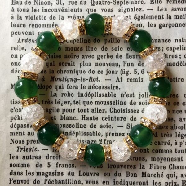 こちらは、緑メノウとクラック水晶のミックスブレスレットです。石との間にはロンデルを挟み高級感溢れるデザインに仕上げています。石大きさは腕にも馴染みやすいように10mm玉で内周約17cm(伸可能)です。気になる方は是非この機会にどうぞ。