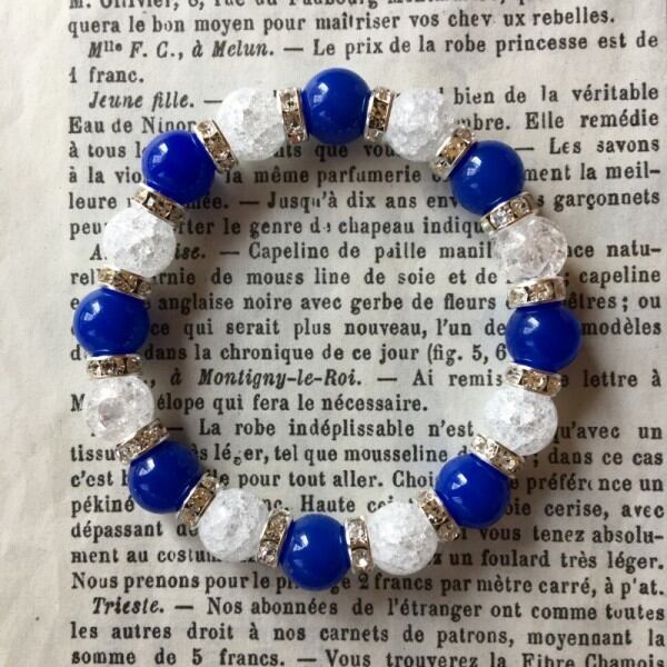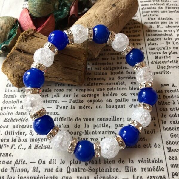こちらは、ブルーメノウ とクラック水晶のミックスブレスレットです。石との間にはロンデルを挟み高級感溢れるデザインに仕上げています。石大きさは腕にも馴染みやすいように10mm玉で内周約17cm(伸可能)です。気になる方は是非この機会にどうぞ。
