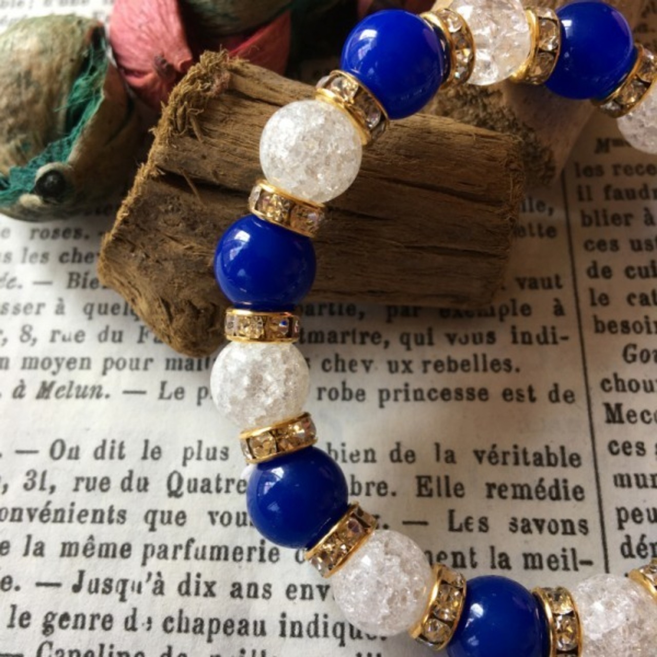 こちらは、ブルーメノウ とクラック水晶のミックスブレスレットです。石との間にはロンデルを挟み高級感溢れるデザインに仕上げています。石大きさは腕にも馴染みやすいように10mm玉で内周約16cm(伸可能)です。気になる方は是非この機会にどうぞ。
