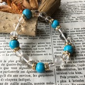 こちらは、10mm玉のターコイズと10mm&8mmの水晶を使用したブレスレットです。今回は五芒星デザインをベースに間にはロンデルを挟み高級感あるデザインに仕上げています。内周約17cm(伸可能)です。気になる方は是非この機会にどうぞ。
