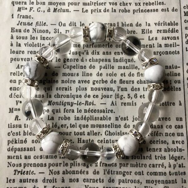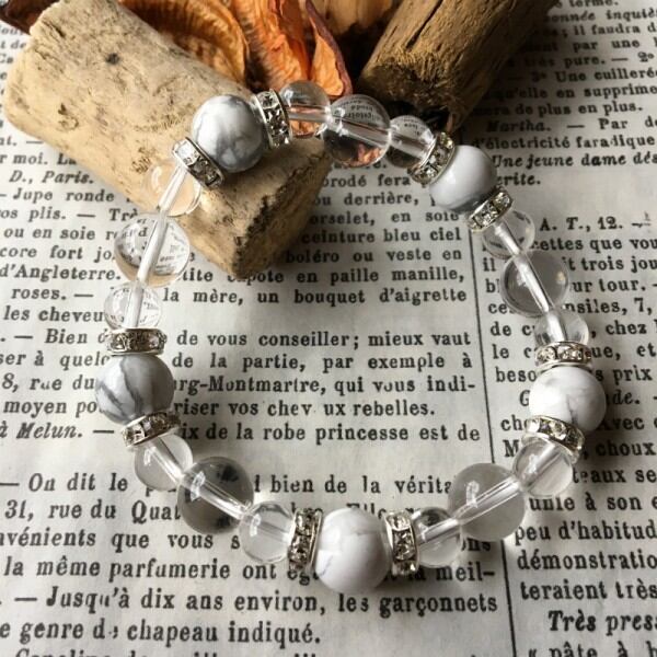 こちらは、10mm玉のハウライトと10mm&8mmの水晶を使用したブレスレットです。今回は五芒星デザインをベースに間にはロンデルを挟み高級感あるデザインに仕上げています。内周約17cm(伸可能)です。気になる方は是非この機会にどうぞ。