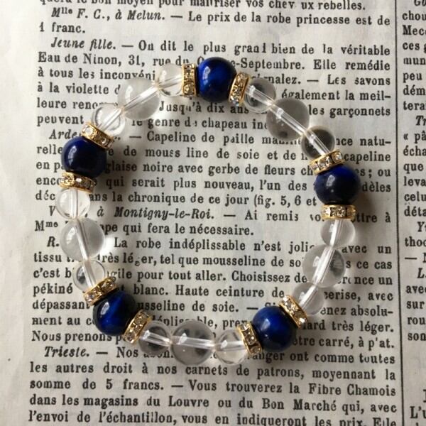 こちらは、10mm玉のブルータイガーアイと10mm&8mmの水晶を使用したブレスレットです。今回は五芒星デザインをベースに間にはロンデルを挟み高級感あるデザインに仕上げています。内周約17cm(伸可能)です。気になる方は是非この機会にどうぞ。