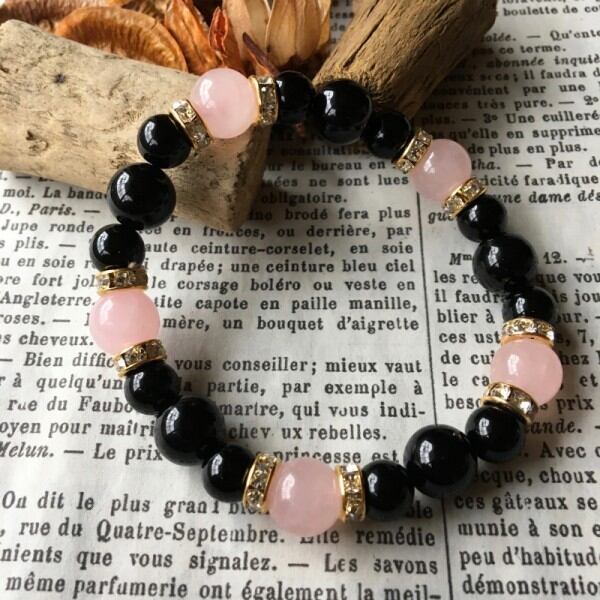 こちらは、10mm玉のローズクオーツと10mm&8mmのオニキスを使用したブレスレットです。今回は五芒星デザインをベースに間にはロンデルを挟み高級感あるデザインに仕上げています。内周約17cm(伸可能)です。気になる方は是非この機会にどうぞ。