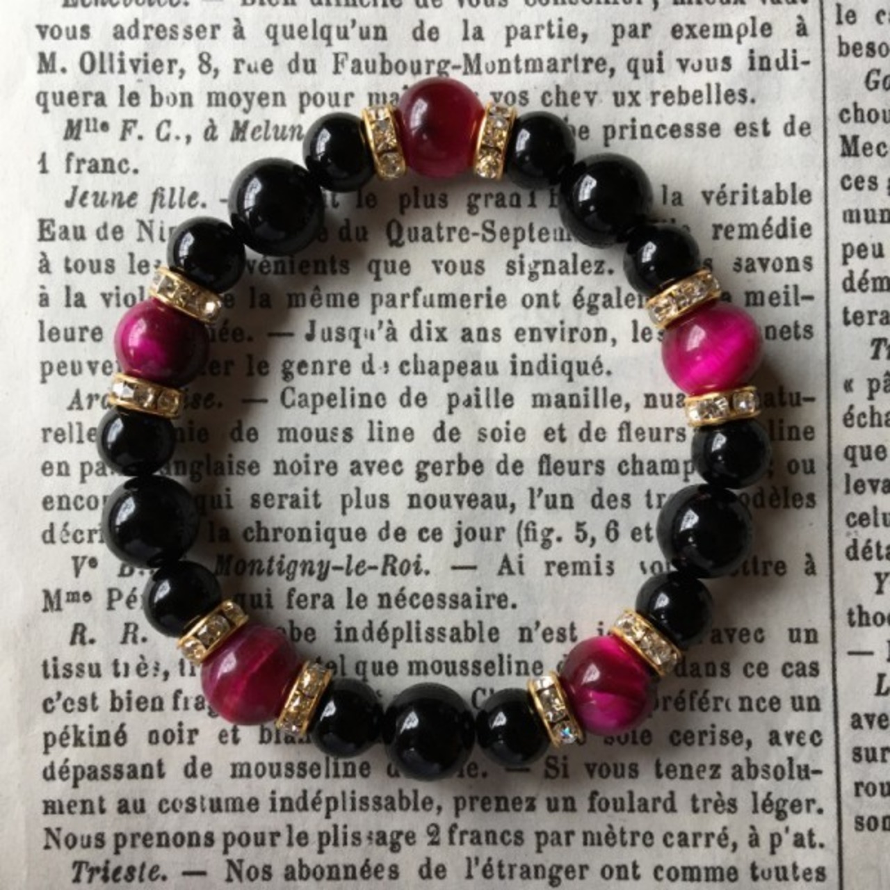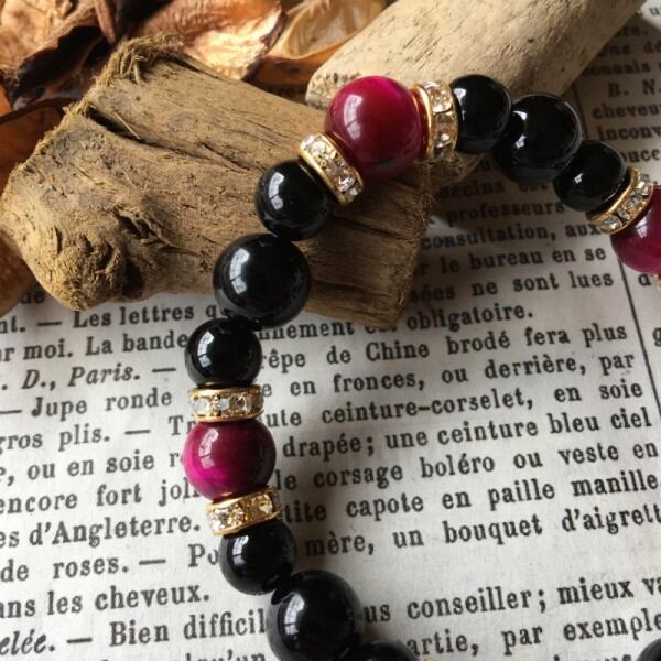こちらは、10mm玉のピンクタイガーアイと10mm&8mmの水晶を使用したブレスレットです。今回は五芒星デザインをベースに間にはロンデルを挟み高級感あるデザインに仕上げています。内周約17cm(伸可能)です。気になる方は是非この機会にどうぞ。