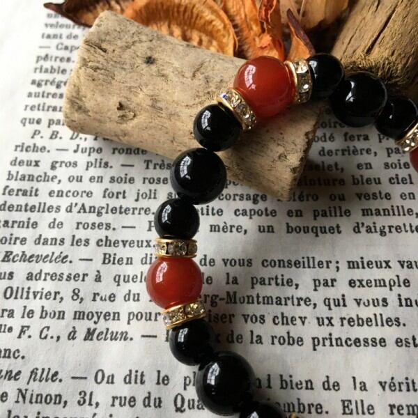 こちらは、10mm玉の赤メノウと10mm&8mmの水晶を使用したブレスレットです。今回は五芒星デザインをベースに間にはロンデルを挟み高級感あるデザインに仕上げています。内周約17cm(伸可能)です。気になる方は是非この機会にどうぞ。