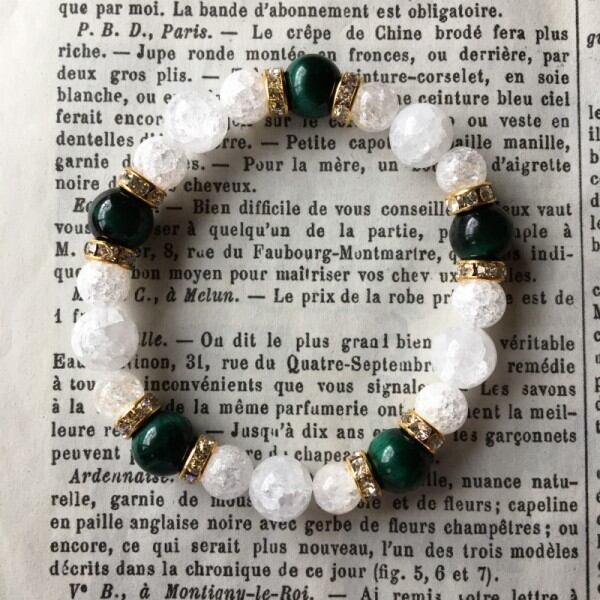 こちらは、10mm玉のグリーンタイガーアイと10mm&8mmクラック水晶を使用したブレスレットです。今回は五芒星デザインをベースに間にはロンデルを挟み高級感あるデザインに仕上げています。内周約17cm(伸可能)です。気になる方は是非この機会にどうぞ。