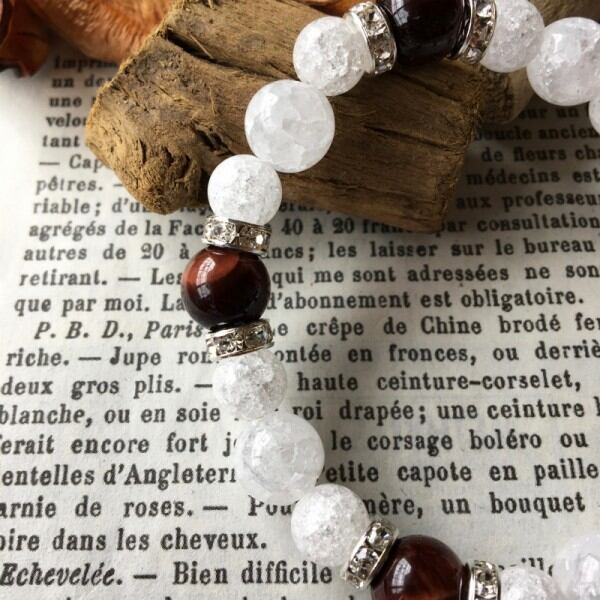こちらは、10mm玉のレッドタイガーアイと10mm&8mmクラック水晶を使用したブレスレットです。今回は五芒星デザインをベースに間にはロンデルを挟み高級感あるデザインに仕上げています。内周約17cm(伸可能)です。気になる方は是非この機会にどうぞ。