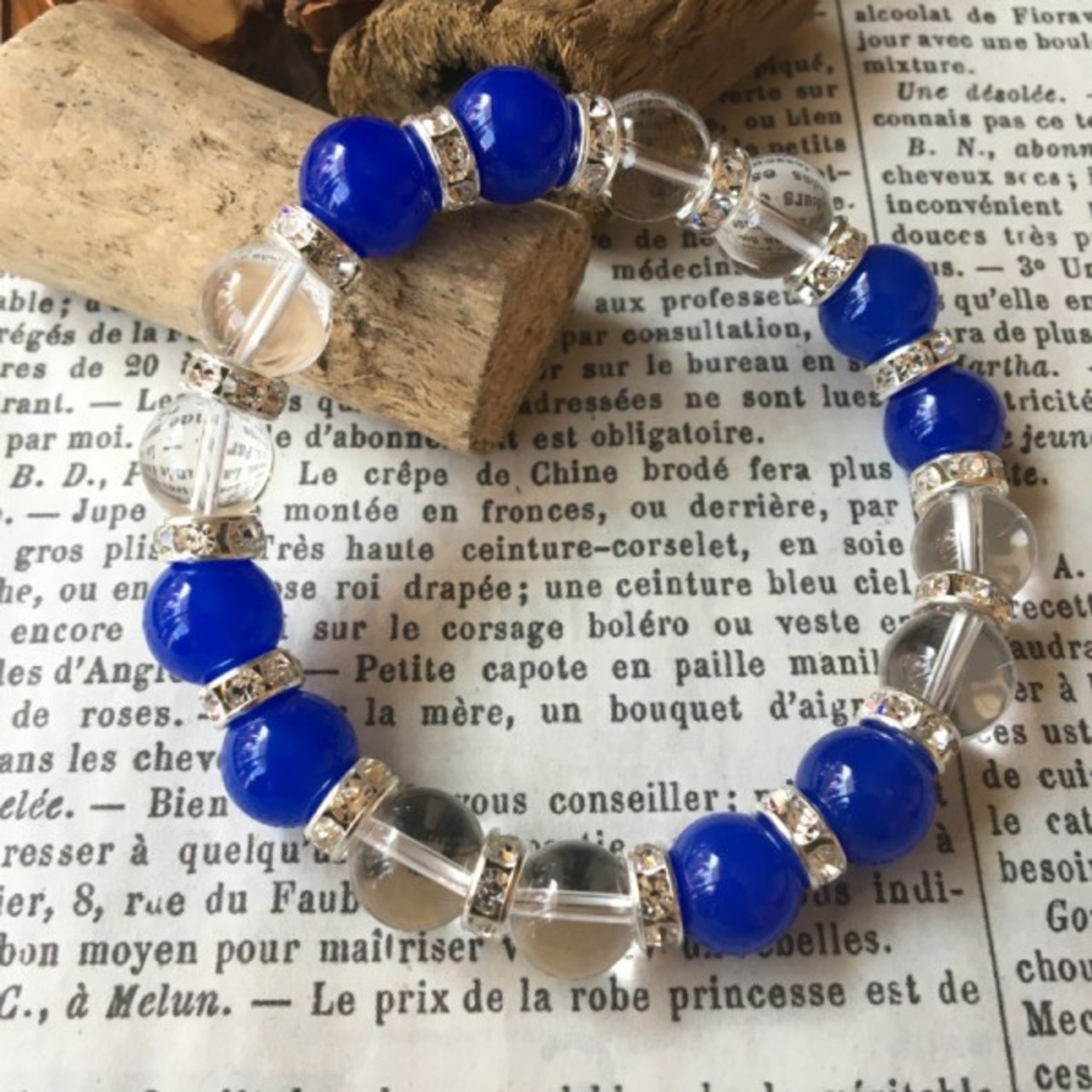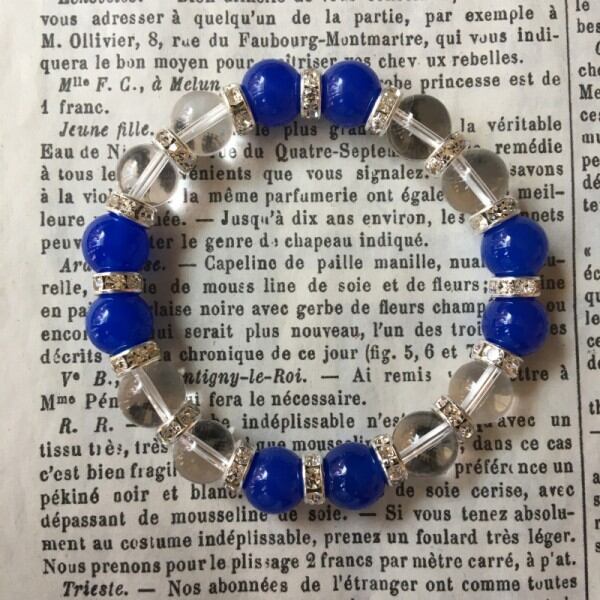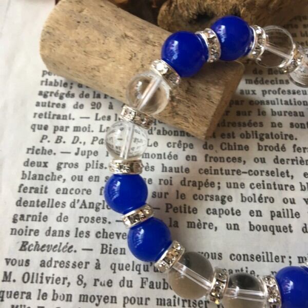 こちらは、ブルーメノウと水晶のミックスブレスレットです。間にはシルバーのロンデルで高級感溢れるデザインに仕上がっています。石大きさは腕にも馴染みやすいように10mm玉で内周約17cm(伸可能)です。気になる方は是非この機会にどうぞ。