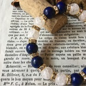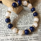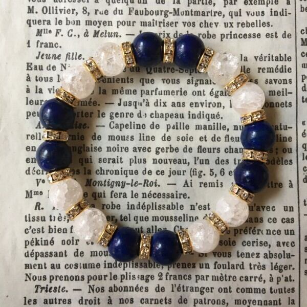 こちらは、ラピスラズリとクラック水晶のミックスブレスレットです。間にはゴールドのロンデルで高級感溢れるデザインに仕上がっています。石大きさは腕にも馴染みやすいように10mm玉で内周約17cm(伸可能)です。気になる方は是非この機会にどうぞ。落札後は、ノークレーム・ノーリターンで宜しくお願いします。